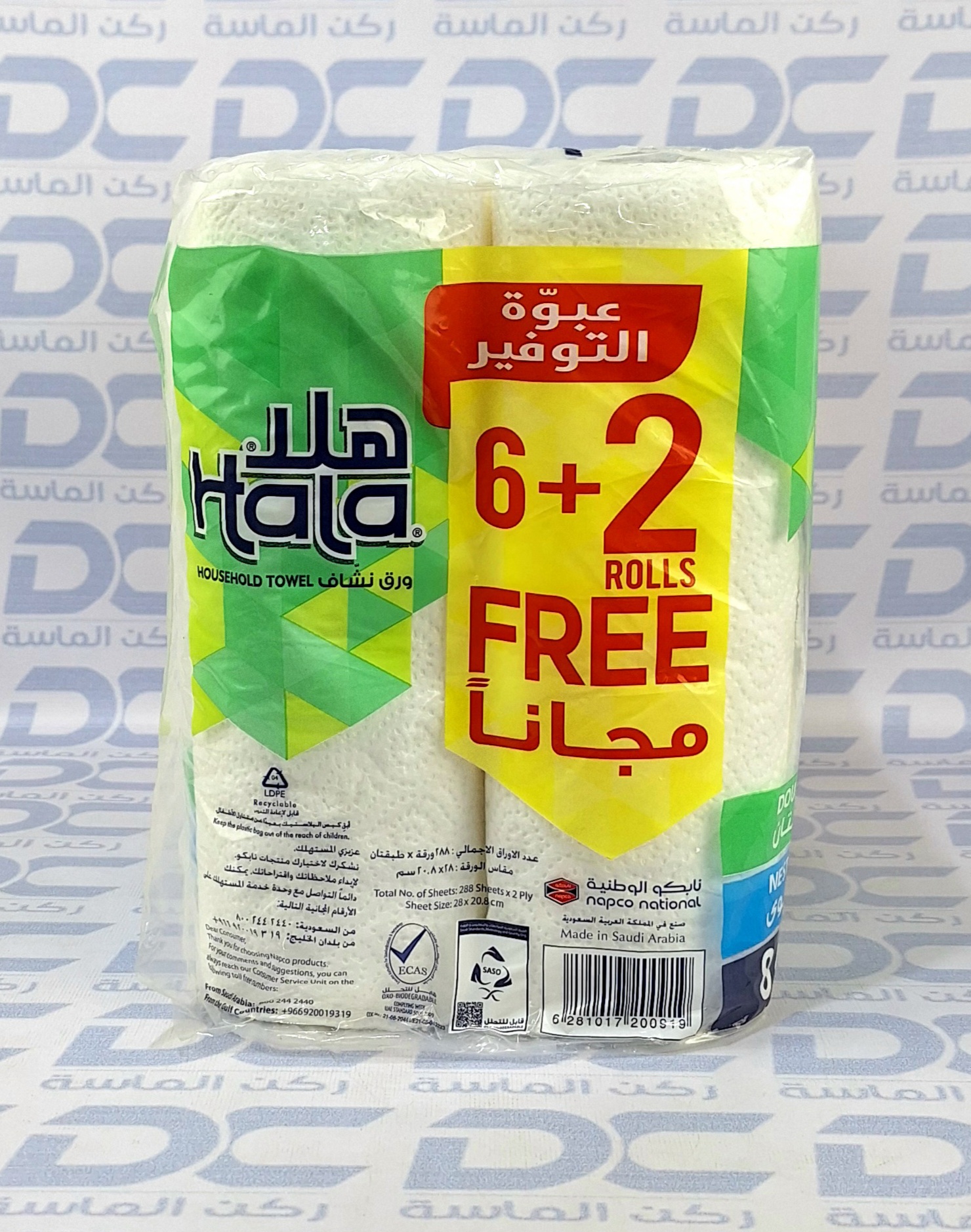 ورق نشاف طبقتان مزدوج هلا رول 6 + 2 مجانا أبيض مطبع ومقوي عبوة التوفير